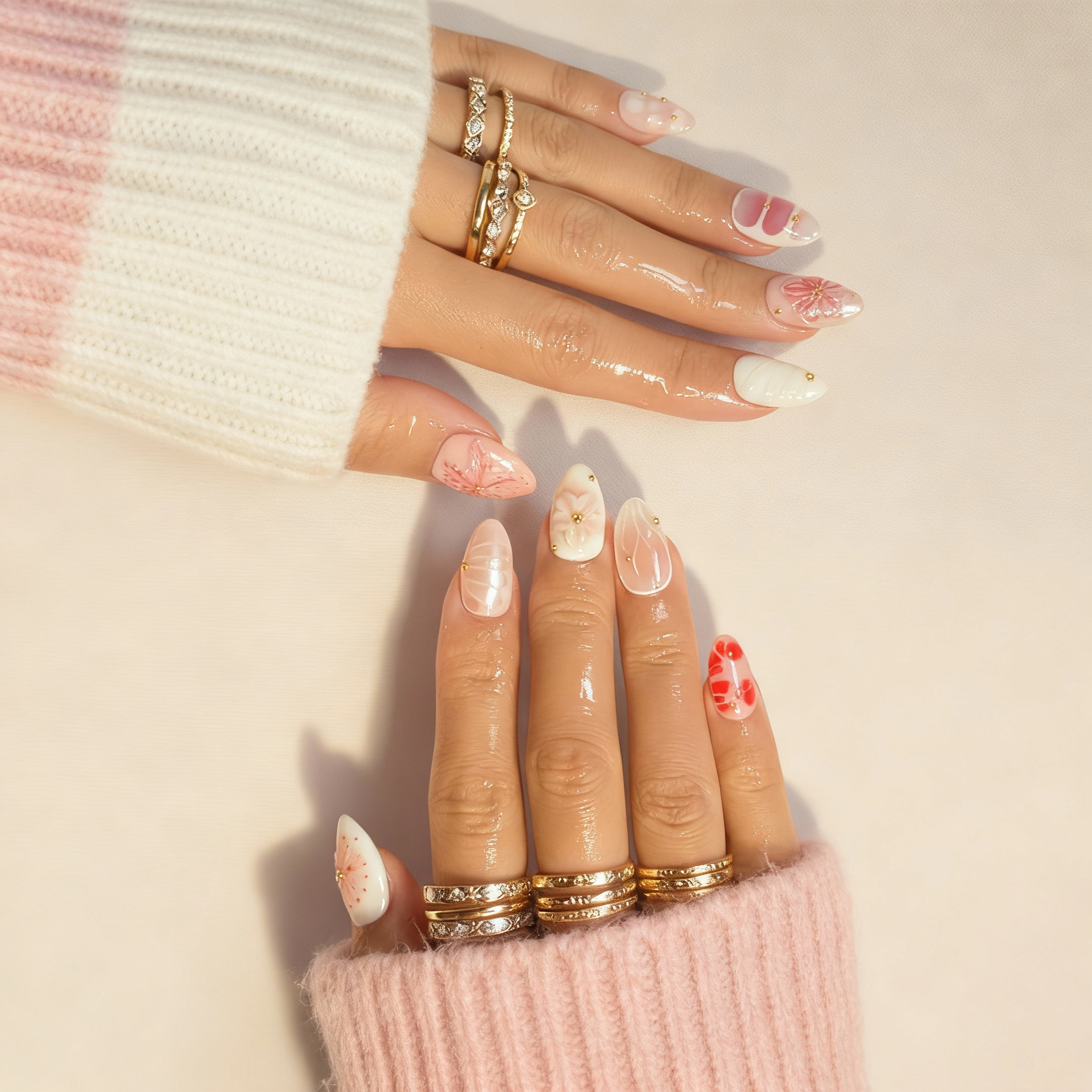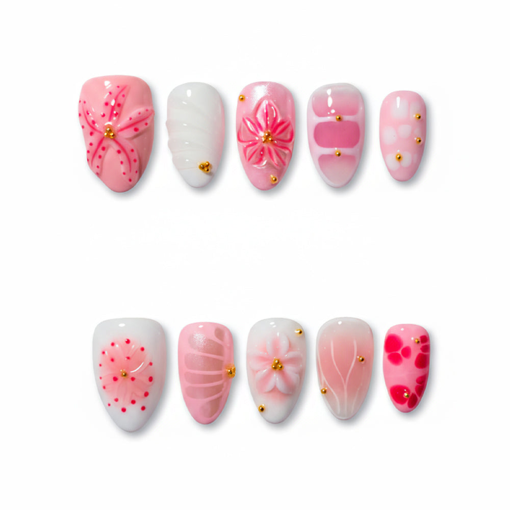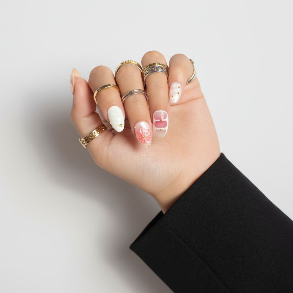 A dreamy blend of sakura pink and white tones, adorned with 3D floral accents and gold detailing. Soft, sweet, and perfect for expressing gentle femininity.