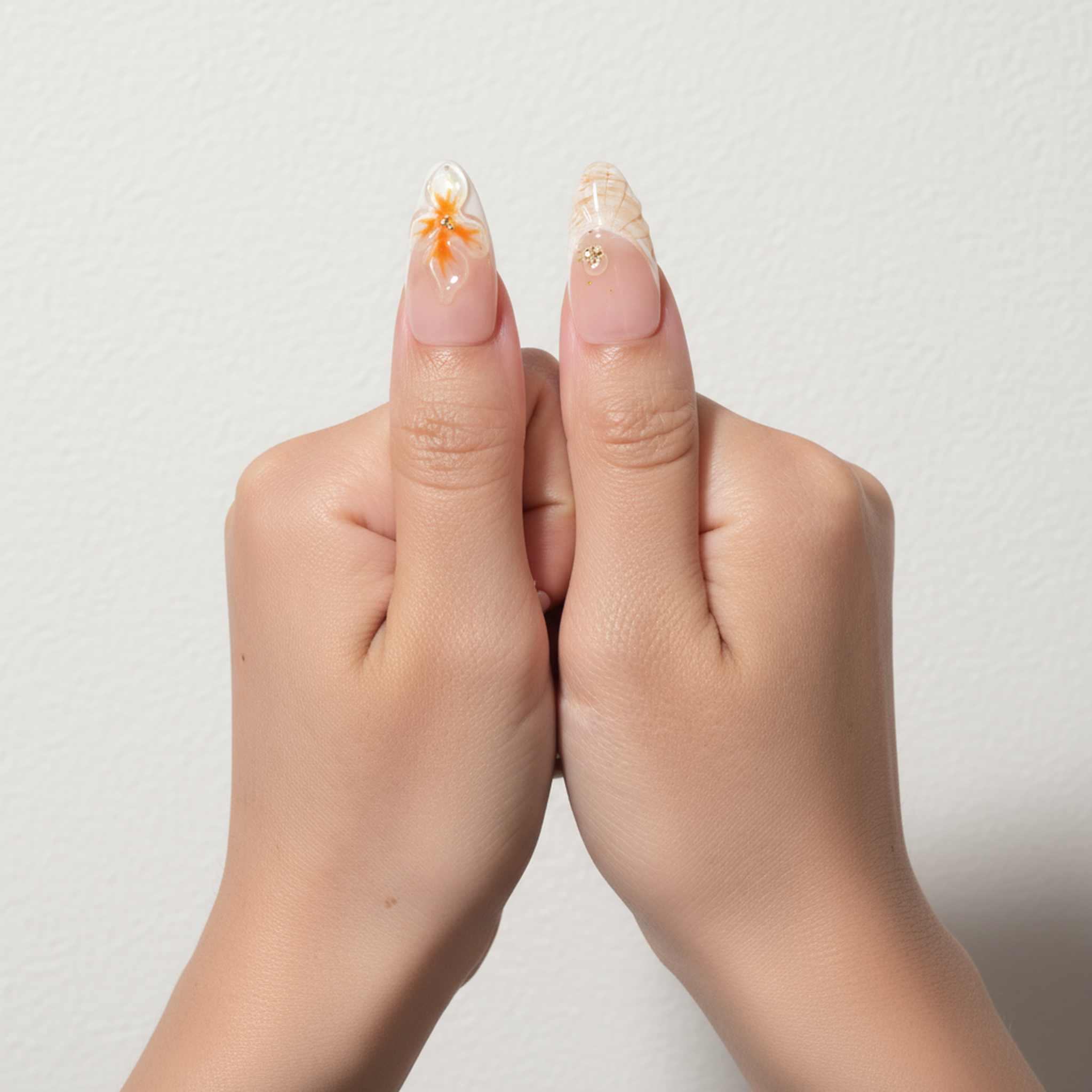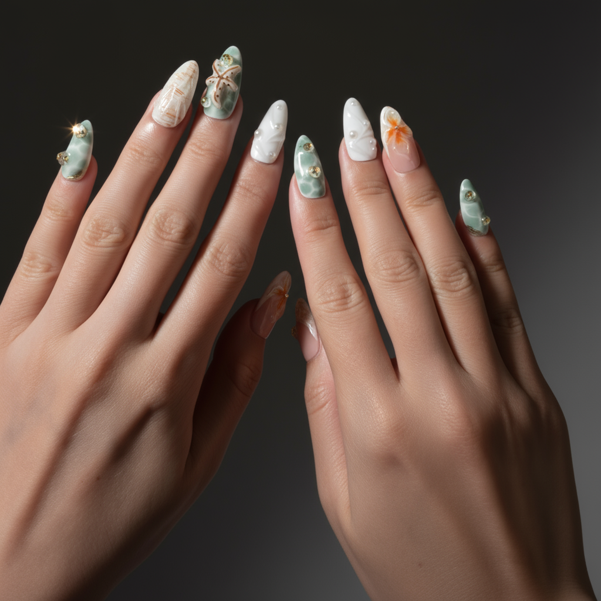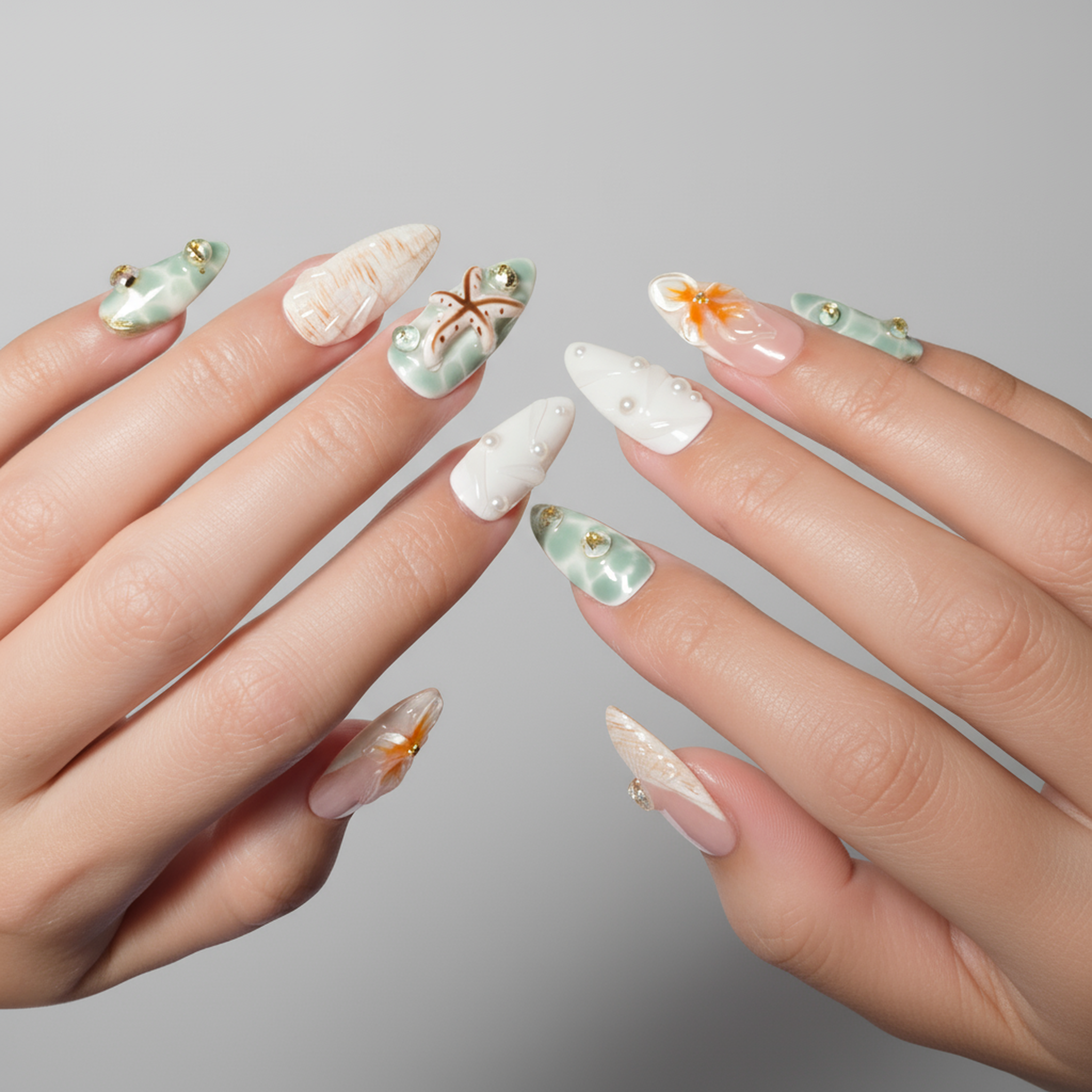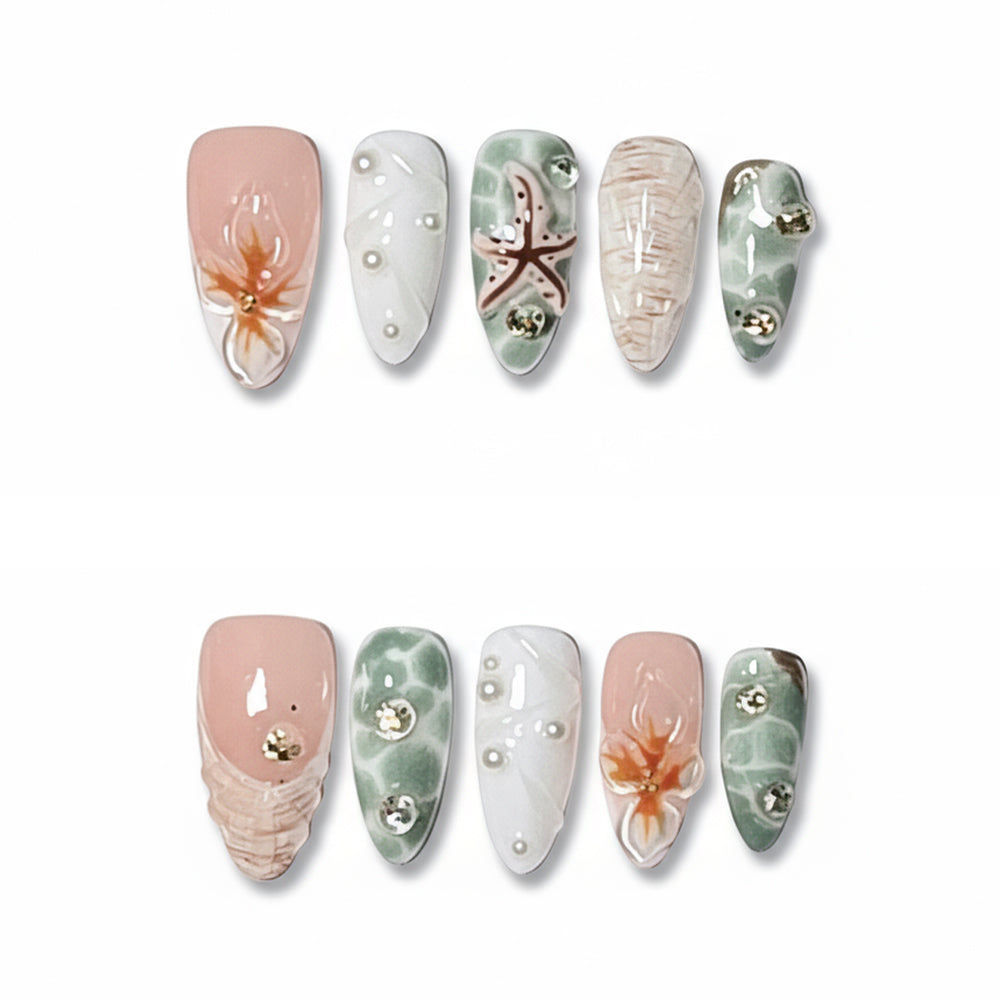 Hand-painted floral and starfish motifs symbolize freedom and natural beauty, adding a touch of summer romance to your fingertips. Perfect for vacations, parties, or everyday elegance.