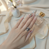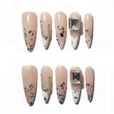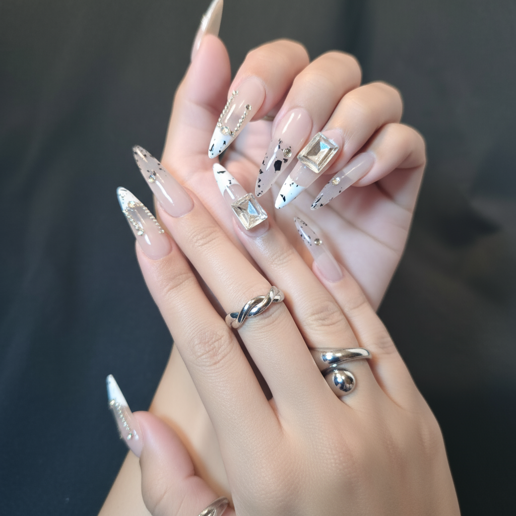 This nail design combines soft nude tones with crisp white tips and abstract black fragments, creating a striking contrast that captures modern sophistication. Inspired by the duality of urban women—graceful yet strong—it embodies quiet confidence and effortless style.