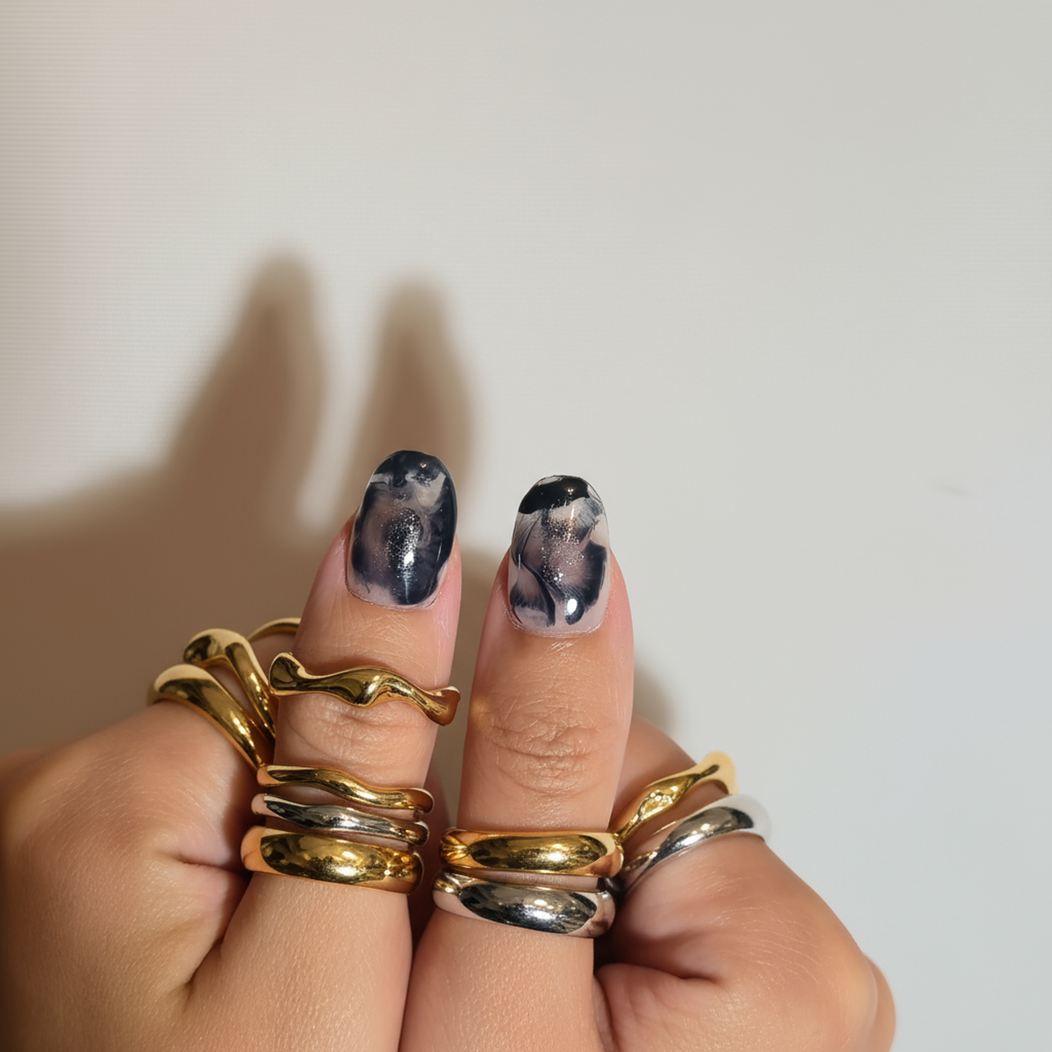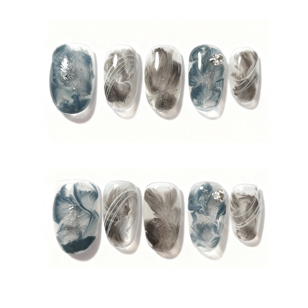 Inspired by the quiet beauty of mist rising over a calm shoreline, this design blends soft gray and muted blue tones into delicate, cloud-like swirls. The gentle transparency and subtle shimmer reflect the tranquil glow of dawn light on water, while the fine white lines suggest the quiet flow of wind and tide.