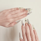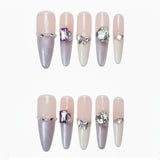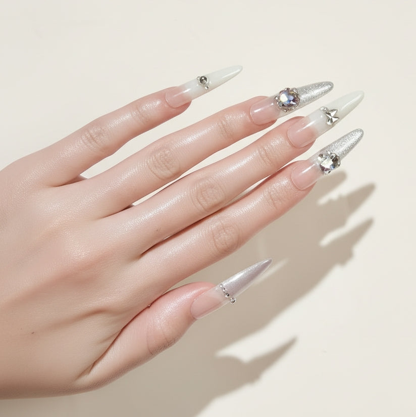 Starlight Amethyst Gradient to eleganckie rozwiązanie dla wydłużonych, smukłych palców. Każdy paznokieć ozdobiony jest wysokiej jakości cyrkonią, która zachowuje blask i nie traci koloru z czasem. Ręcznie wykonane z materiałów przyjaznych środowisku, paznokcie są w pełni wielokrotnego użytku. Idealne dla początkujących – łatwe do aplikacji i usunięcia. Połączenie trwałości, piękna i zrównoważoności w jednym produkcie.
